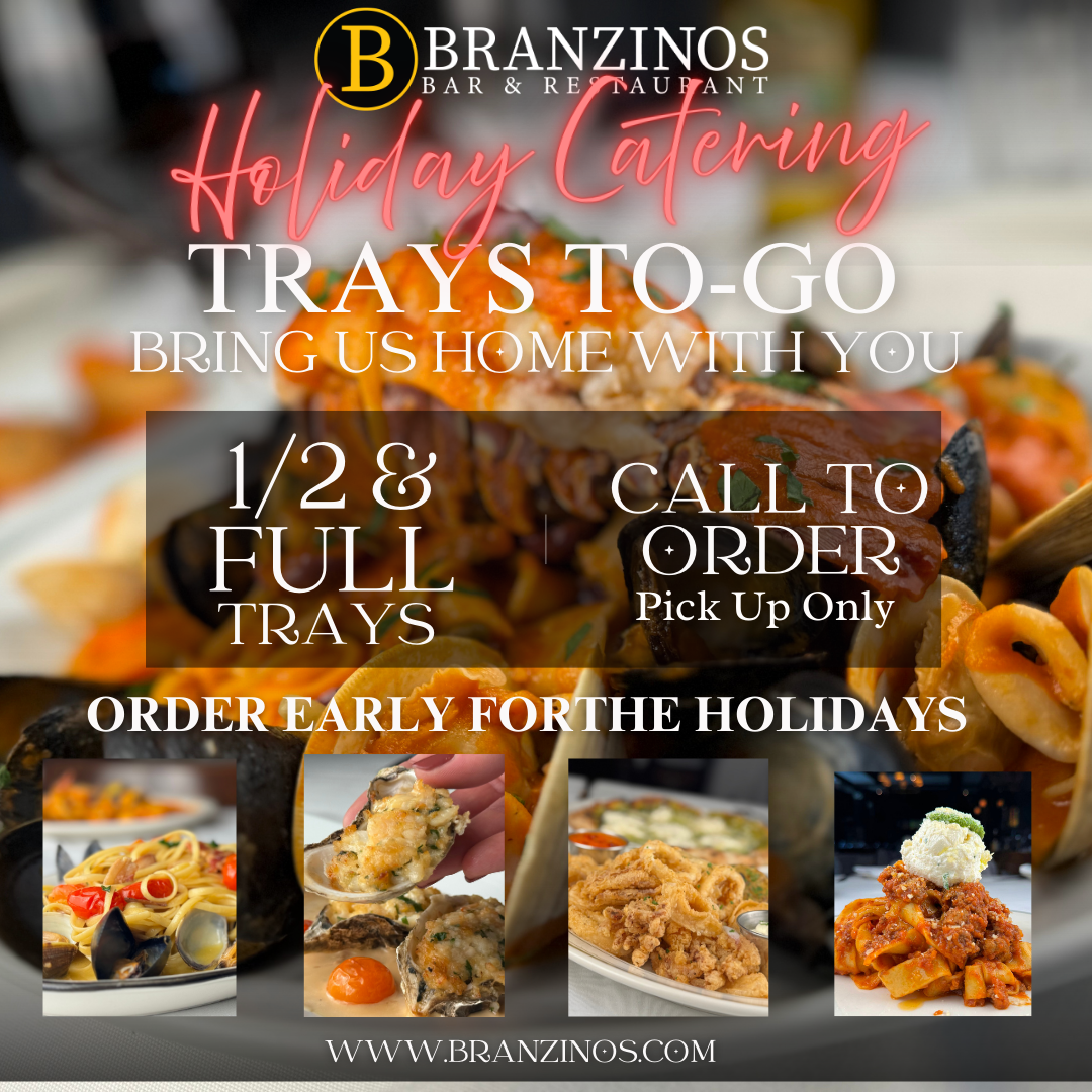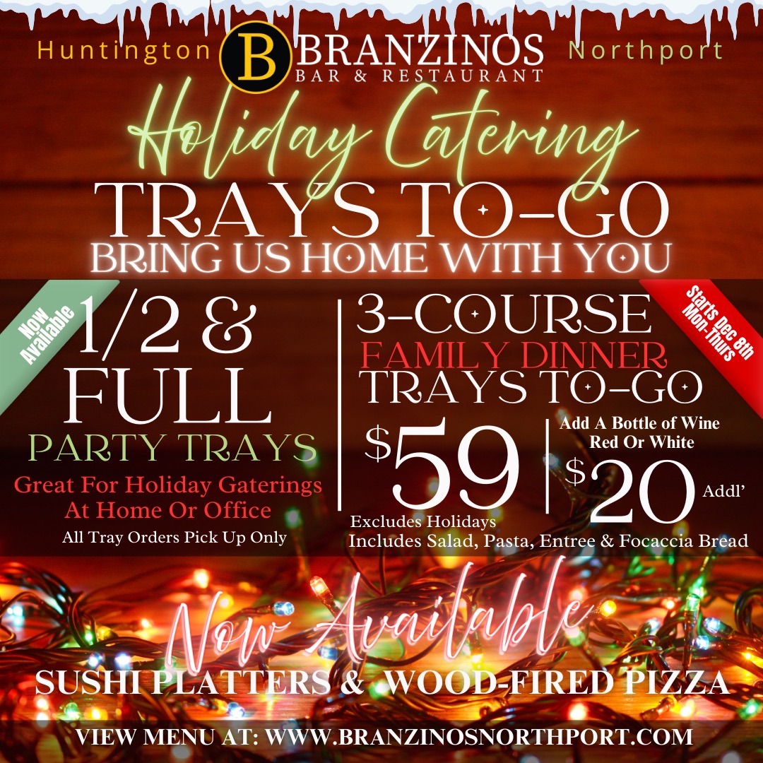 Plan your family gathering, corporate event, or friendly gathering at Branzinos. We offer custom catering packages to meet your affairs needs. From our special package menus to our hand-crafted catering selections, you can be assured a 5-star, top-shelf day at Branzinos. Contact us to discuss your catering needs at (631) 944-3141
