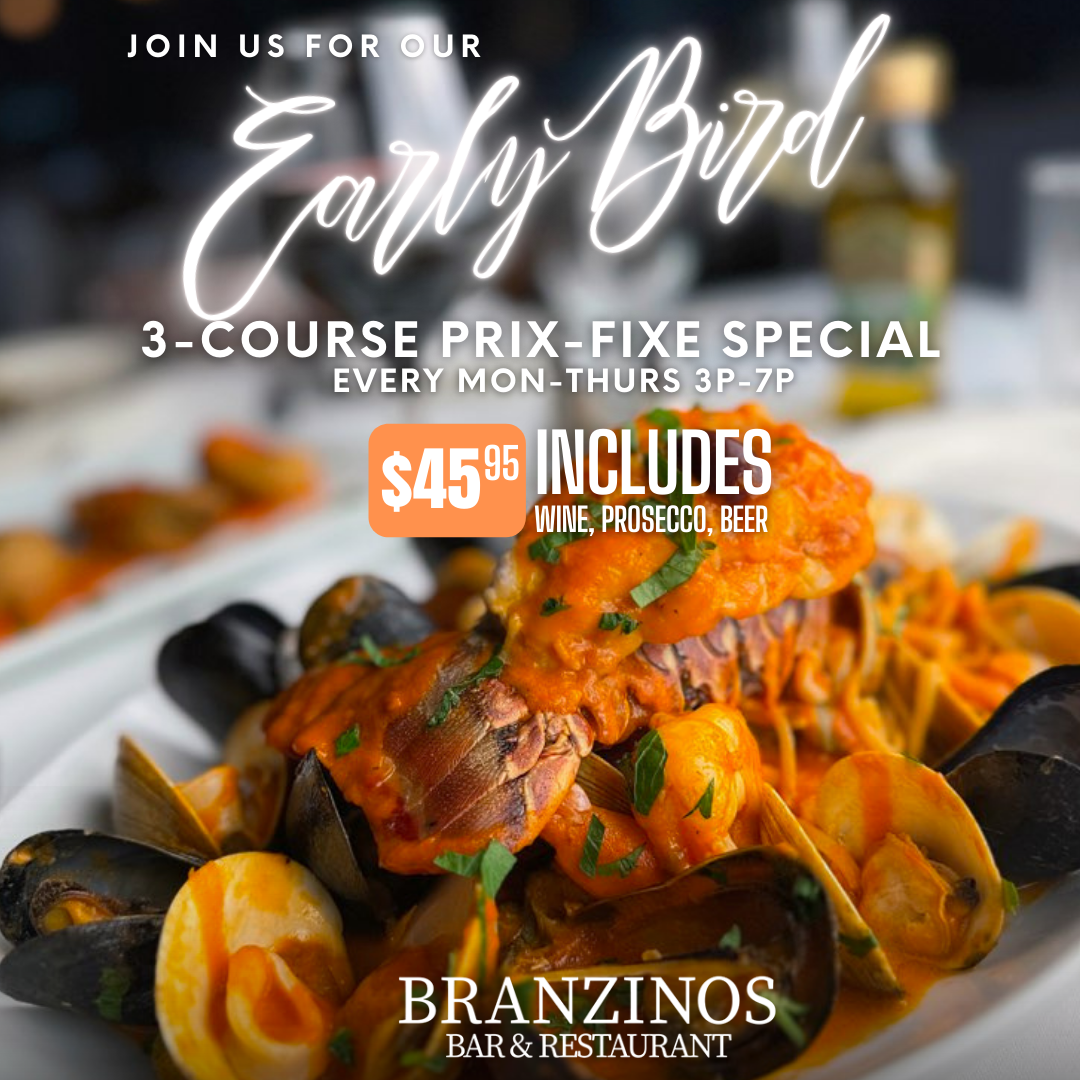 Now offering our $45.95 “3-Course Prix-Fixe Early Bird Special” 🍷✨ Available Monday – Thursday from 3 PM to 7 PM, this chef-selected menu features our signature seafood, pasta, and fresh specials—Includes one complimentary glass of wine, Prosecco, or beer! Every Monday-Thursday 3p-7p